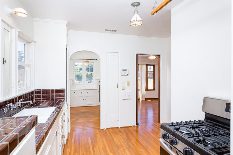 • Vintage Kitchen with maroon tile, Stainless Steel Refrigerator, White Cabinets and gas stove